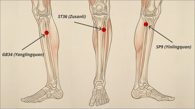 stimulácia akupresúrnych bodov ST36, SP9 a GB34